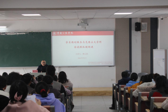 韩教授首先分析了马克思主义理论学科学术论文写作与发表的现状,既有“马克思主义理论学科现有规模庞大,人员众多、话题前沿,与时俱进、视野宏观,站位高远”等优势,也面临“影响力不足、模式化严重、主观性明显、工作量不足”等困境。基于这些优势与困境,韩教授从学术期刊的视角详细阐述了学术传播、学术生产、学术传承的全流程框架,强调了学术论文的结构要件以及如何进行选题等细节规范;同时,还从文章结构、参考文献、语言表达、意识形态等多维度详细地为师生们讲解了如何进行学术论文的优化。韩教授指出,好文章不是写出来的,而是改出来的,要进一步深挖期刊的核心需求和发文规律,才能更高效地写出高质量的文章。